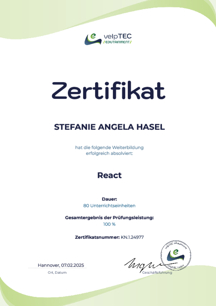 Ich bin Stefanie Hasel – Frontend Entwicklerin mit einem Faible für Design, Code und kreative Lösungen.