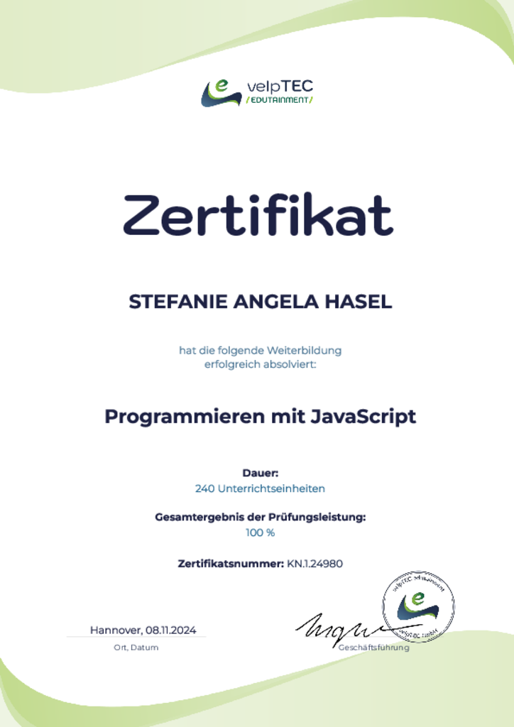 Ich bin Stefanie Hasel – Frontend Entwicklerin mit einem Faible für Design, Code und kreative Lösungen.